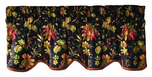 Exquisite and versatile, this classic Waverly window valance features a multi-colored Jacobean floral on a black ground. The 50-inch W by 15-inch L scallop valance is embellished with a fancy gimp trim for added style. Perfect for kitchen, bedroom, living room or bath.You will not be disappointed with