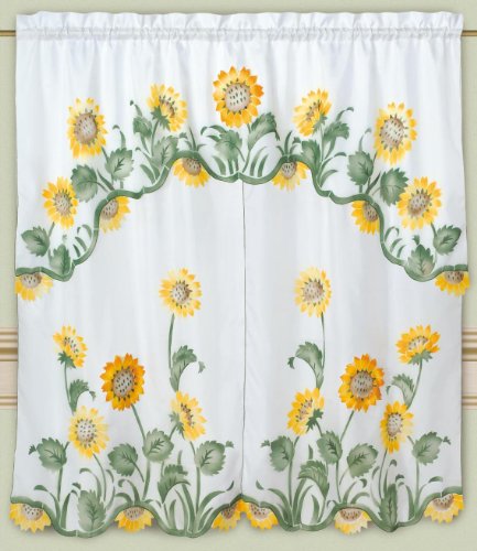 Ariana's Sunflowers Kitchen Curtain will be a cheerful addition to your kitchen windows. A charming pattern of a field of sunflowers is airbrushed on both the valance and the tiers. Accented with a green scalloped edge. The valance and two curtains are all attached together, making installation simple. Rod pocket for easy installation.You will not be disappointed with