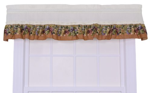 Ellis Curtain Kitchen Collection Tuscan Hills Grape Ruffled Valance-We've designed our Kitchen Collection Line with three things in mind. To have beautiful printed patterns, be machine washable and inexpensive. The Tuscan Hills Grape Collection is an elegant pattern of purple, white and red grapes with flowering vines set with a gingham check on a solid ivory background that will reflect the atmosphere, mood and theme that you are looking to create in your kitchen. Made from 70-percent polyester/30-percent cotton creates a sturdy valance that is extremely durable and will hold its color and shape even after repeated washings. The ruffled valance is constructed with a standard 1-1/2-Inch rod pocket, 1-1/2-Inch header and printed ruffled border. Length is measured overall 12-Inch from header top (ruffle above the rod pocket) to bottom of panel. Width is measured overall 52-Inch. For wider windows simply add multiple ruffled valances together. Great to use alone or with the coordinating Tuscan Hills Grape ruffled swag that can be purchased thru Amazon. Also available are coordinating tailored tier curtains. Conveniently machine washable, Made in the USA,You will not be disappointed with