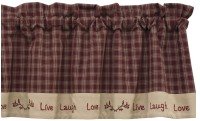 Sturbridge Curtain Valances, by Park Designs. Live, Laugh, Love Sturbridge valance feature a warm plaid design with a burgundy color. Live, Laugh Love is embroidered at the bottom of the valance. Sturbridge design gives you that country and primitive lookYou will not be disappointed with
