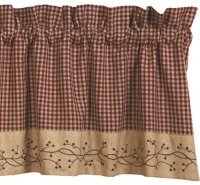 The Checker Berry Primitive Valance is a wine and tan check. The tone on tone tan hem of this primitive valance is accented with embroidered berry vine complete with wine berries. The Checker Berry curtain valance is ideal to add a bit of country to any rYou will not be disappointed with